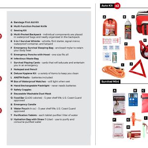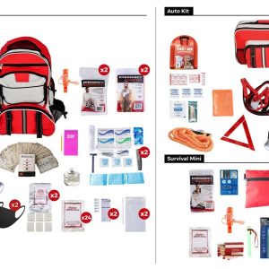 This Package is designed to fill all of the preparedness needs of 2 individuals by providing emergency supplies for the home, car, and one other location.
